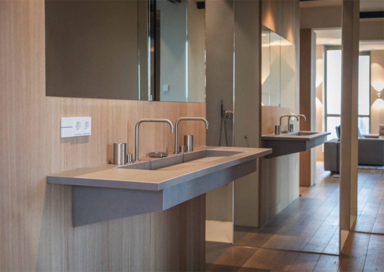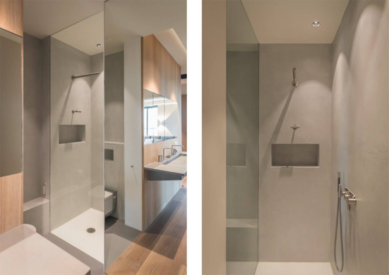 In principe is de badkamer altijd open, wat de ruimtelijkheid van het appartement sterk vergroot. De badkamer lijkt overigens helemaal niet op een badkamer. Vanuit de woonkamer kijk je tegen een spiegelpaneel aan, waarachter de douche geplaatst is. Het parket loopt door in de badkamer tot aan de spiegel. Zo lijkt de vloer nog veel verder door te lopen. De boekenkast loopt vloeiend over in het wastafelmeubel op maat.