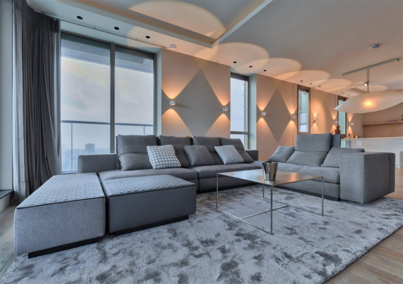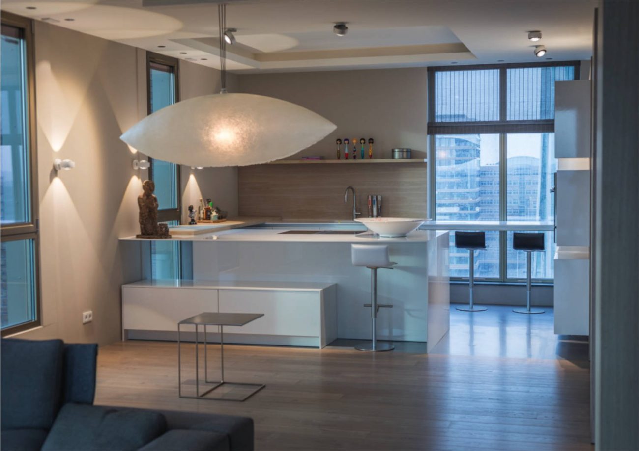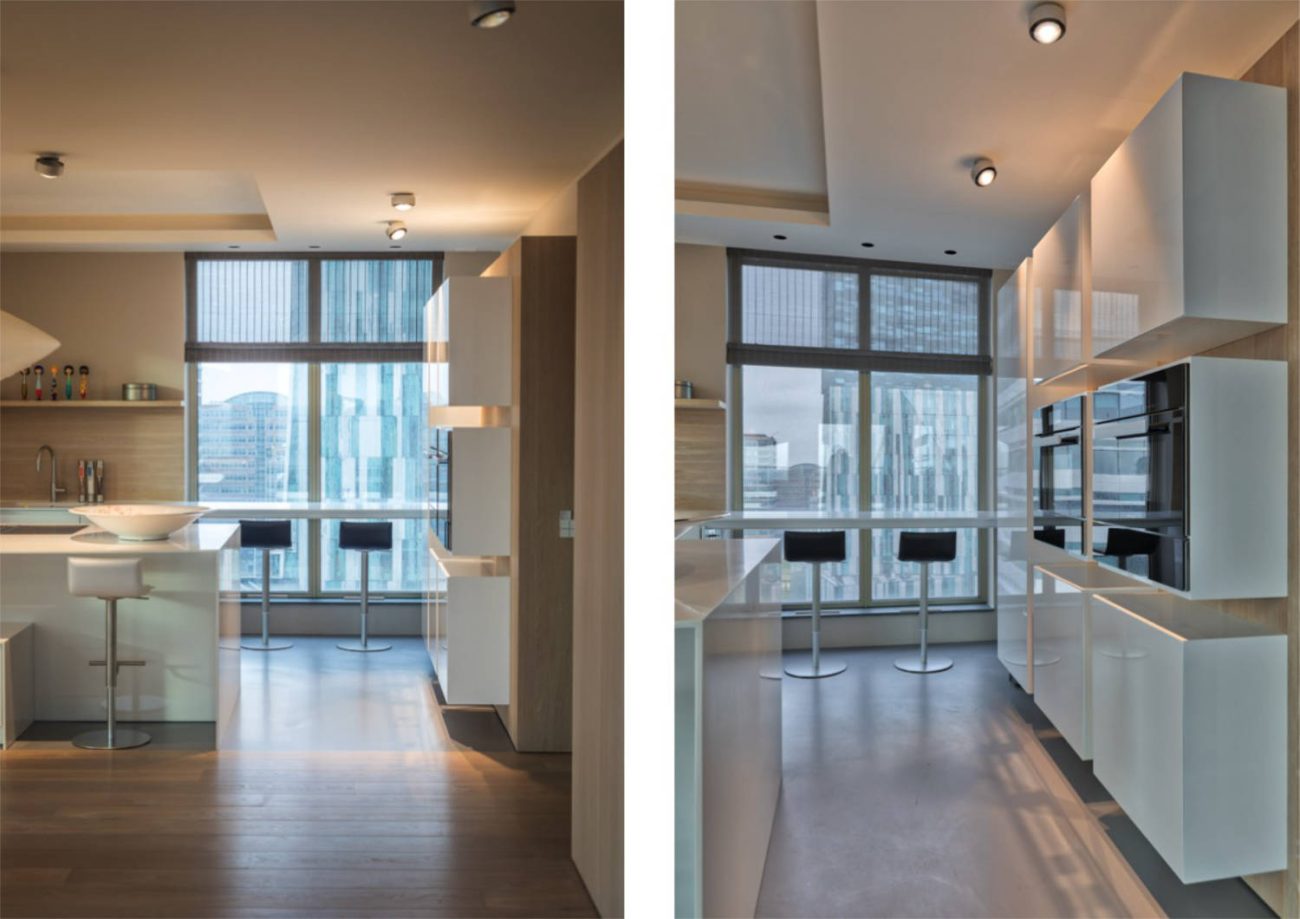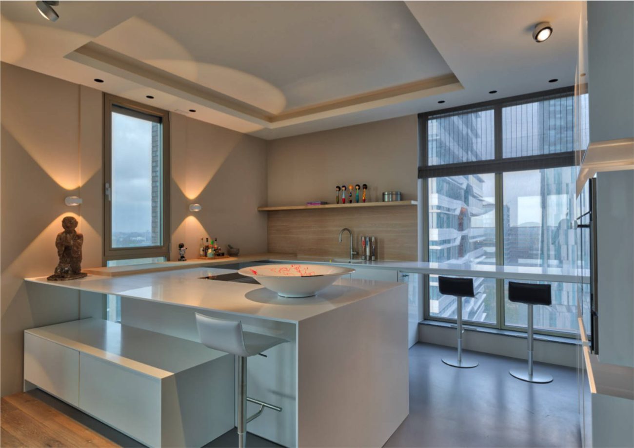 Verlaagde plafonds maken het mogelijk om te spelen met licht en ruimtelijkheid. Hier is dit toegepast zodat de plafonds in de badkamer en keuken verhoogd lijken. Zo kon op die plaatsen gewerkt worden met indirect licht, wat meteen een mooi effect met zich meebrengt op de ramen. Die lijken door de verlaagde plafonds door te lopen tot aan het plafond.