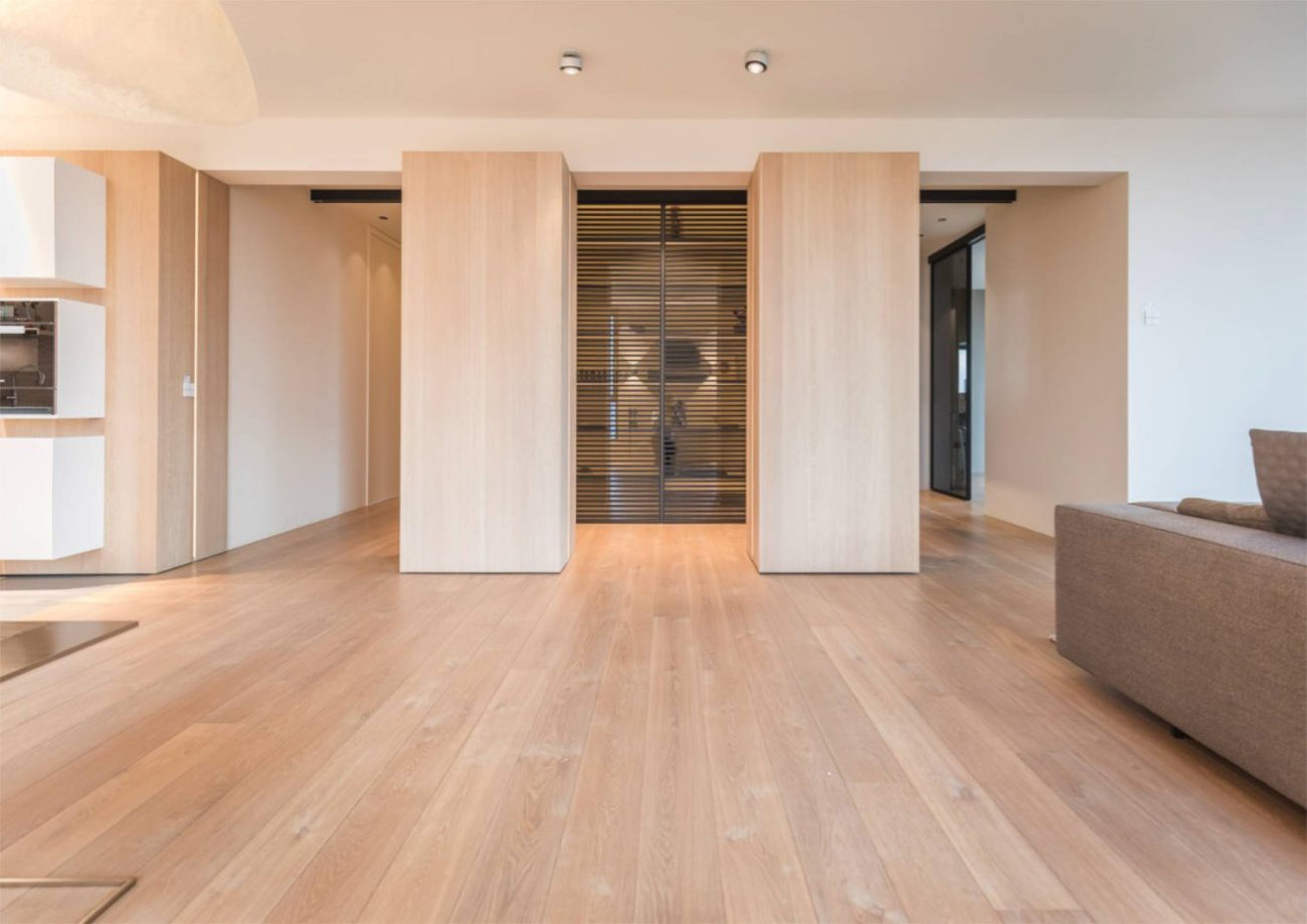 De houten voorzetwand loopt door naar de woonkamer, waar het overgaat in twee verborgen kasten. Daarachter zitten twee betonnen muren.